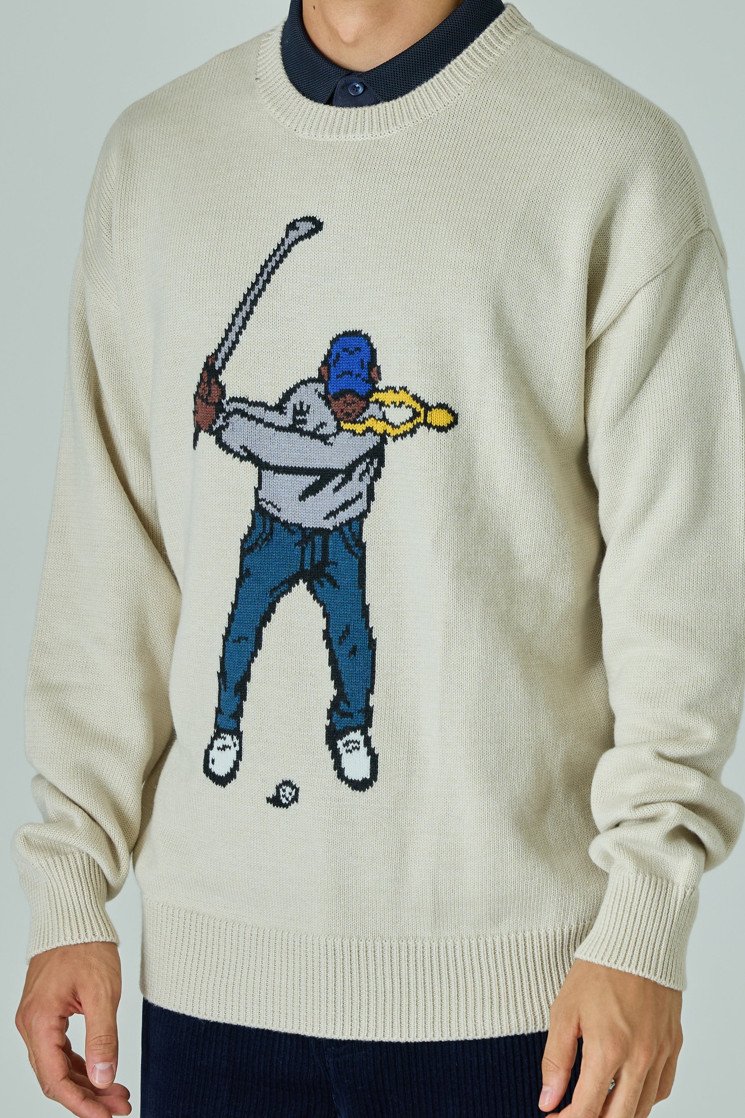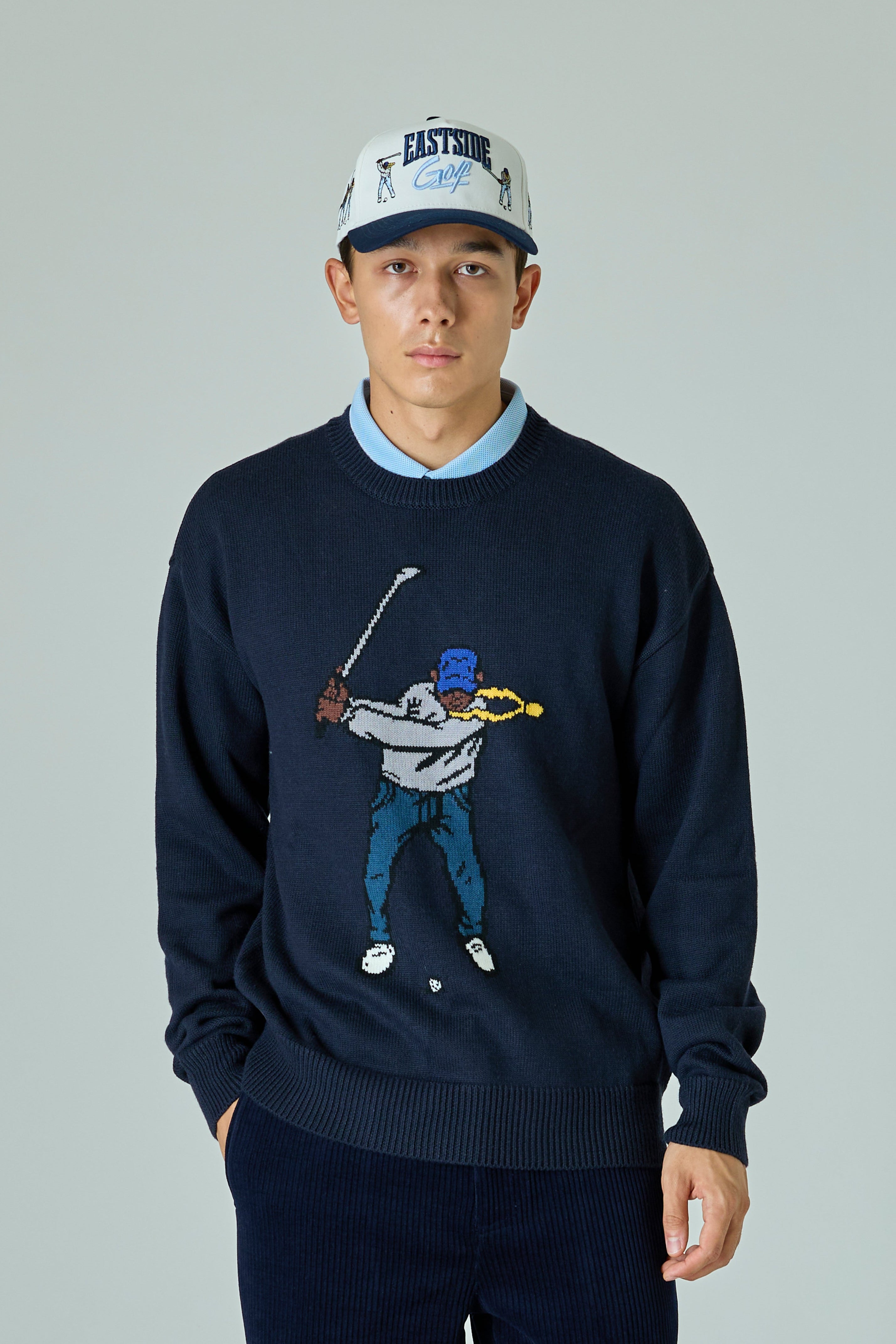 ブランドの象徴スウィングマンをインターシャ編み地で大胆に表現。