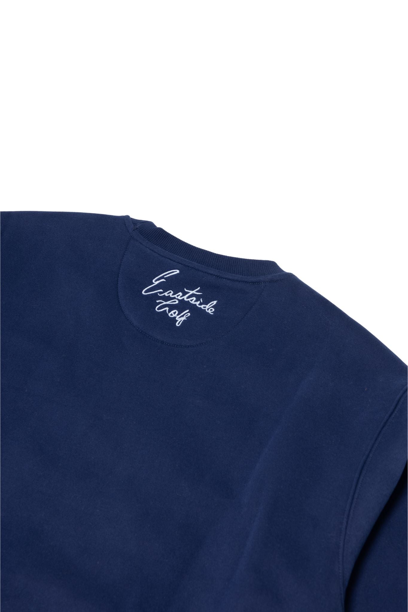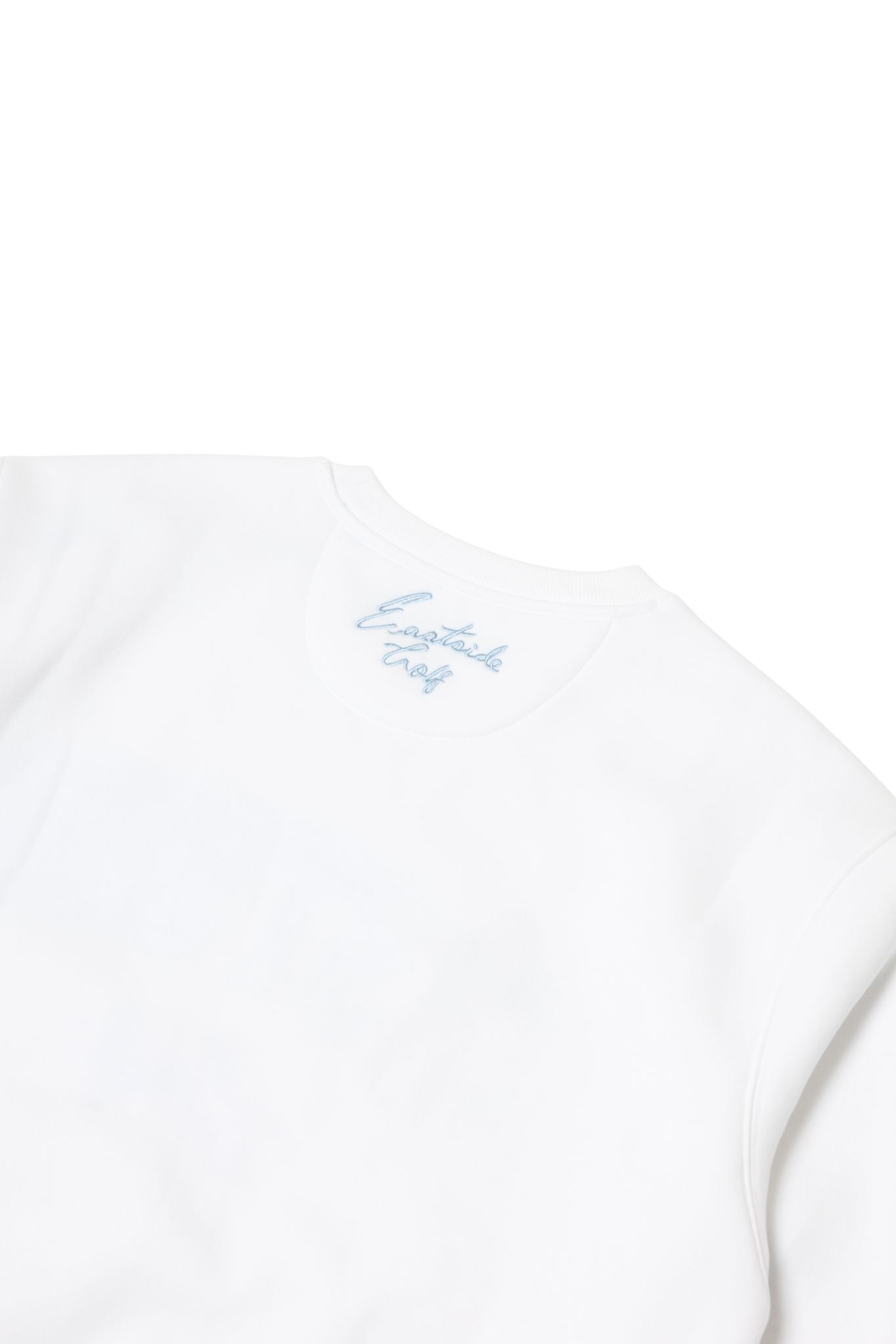 クラシックなクルーネックに、カレッジ風の刺しゅうがEastside Golfならではのストリートなエッセンスに。